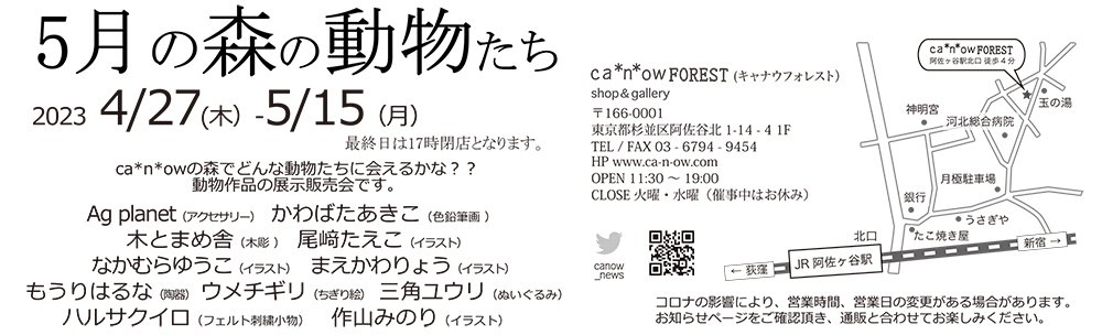 🌳展示のお知らせ🌳 🐻5月の森の動物たち🐻 会期:4月27日~5月15日 会場:ca*n*owFOREST様 熊とか描きました!よろしくお願いいたします😆‼ 【ca*n*owFOREST】 〒166-0001 東京都杉並区阿佐ヶ谷北1-14-4 1F OPEN 11:30-19:00(火・水定休) HP : ca-n-ow.com