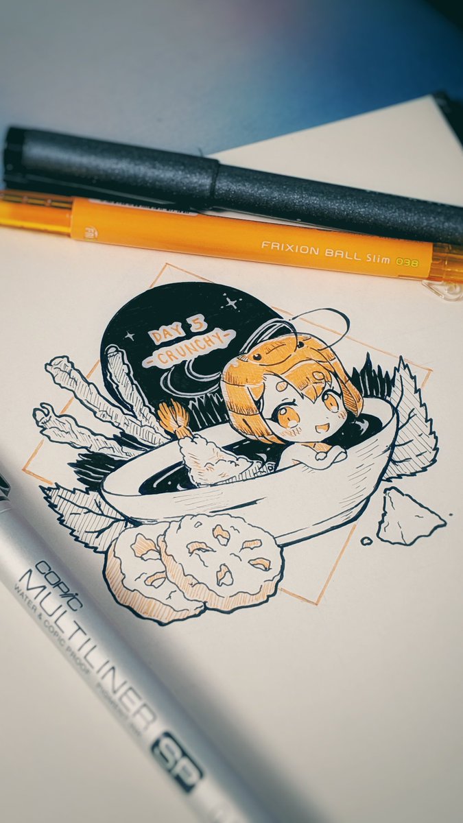 Day 5 -Crunchy- 🦐Tempura Shoujo🦐: Loves to swim in Tentsuyu dipping sauce. Extra crunchy and crispy. Sometimes found with Agedashi Tofu. - #inktober #inktoberday5 #inktober2019