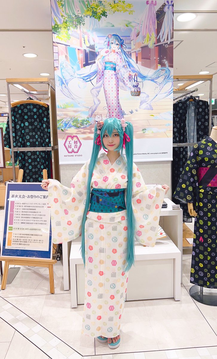 今日も元気に浴衣ミクでいますー! 名古屋タカシマヤでのコラボは明日まで💖 #初音工房 #コスプレ