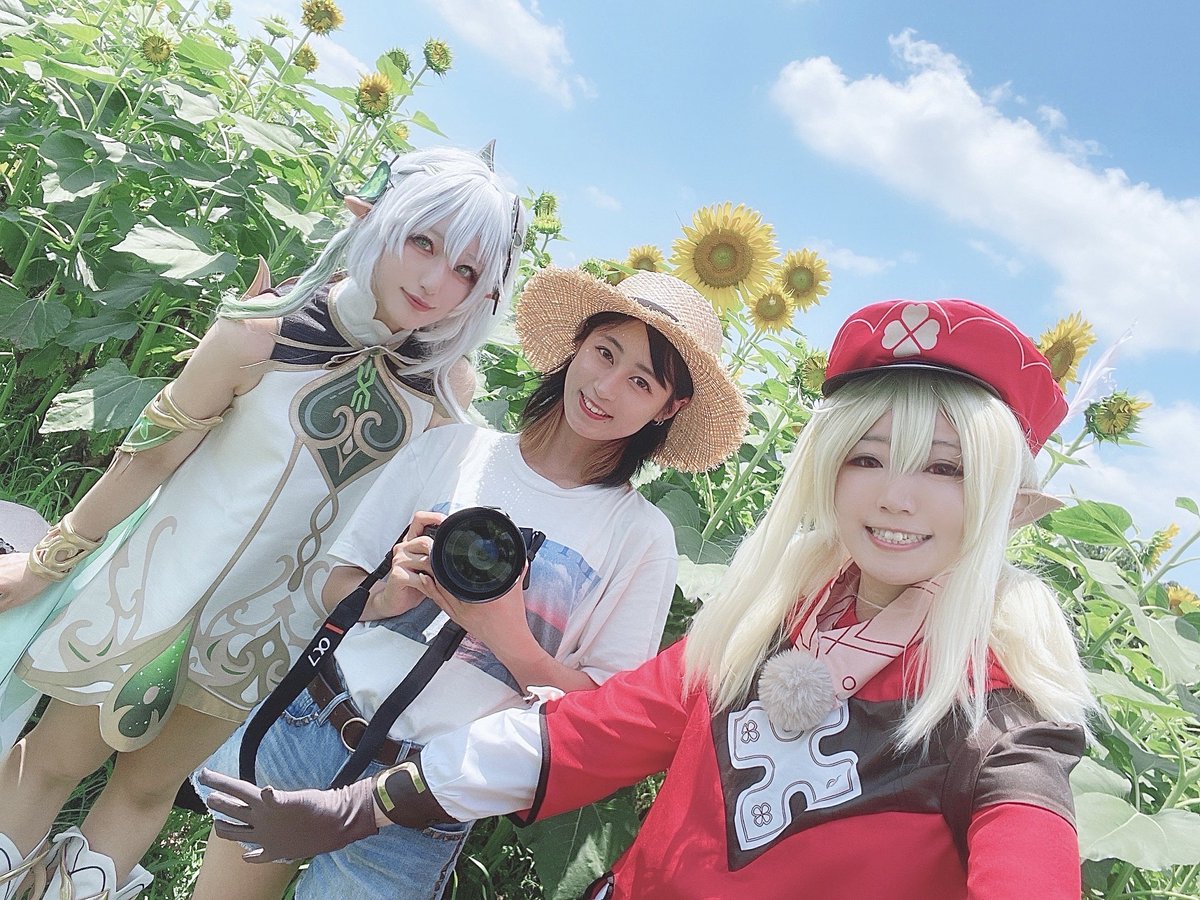 おそほー! 原神のクレーちゃんで早朝🌻 なんとか咲いてて嬉しかった☺️💓 暑い中2人ともありがとう!! ナヒーダ@hikanaaan0819 真ん中幼女@1425_shiori
