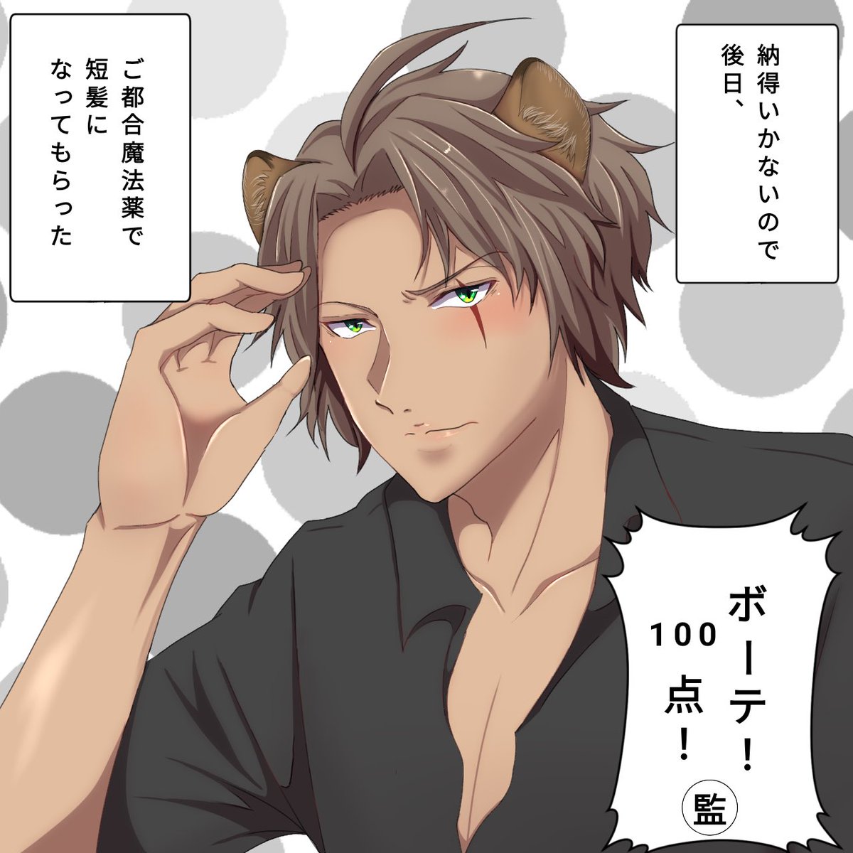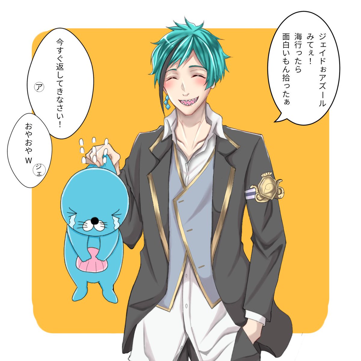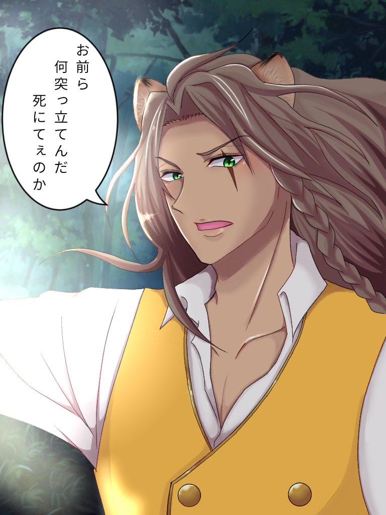 私、刀剣乱舞の明石国行が好きなんですけども、あのお胸のバッテンがずっとえちちだなって思ってて、おじたんにやったらえちち爆発すんじゃね?ってなって、こうなりました(笑) #twstファンアート #ツイステファンアート