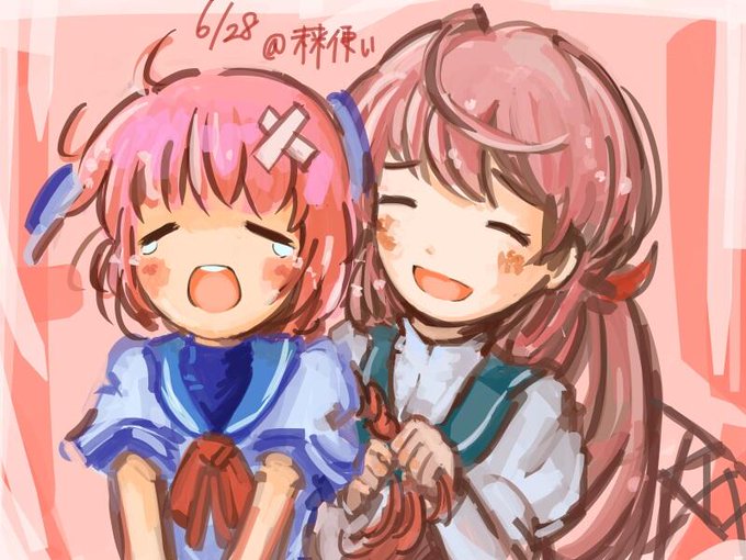 9 22 悔しいよぉ……。 遅刻常習犯が描く子日×明石のピンク髪ペア。 #艦これ版深夜の真剣お絵描き60分一本勝負 14/06/28 23:18