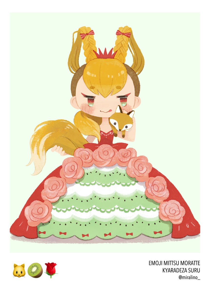 #絵文字3つもらってキャラデザする #イラスト 最後の3枚目です。 「🐱🥝🌹」ごめんなさい、間違えてキツネで描いちゃったけど、よくみたら猫の絵文字ですねこれ…ゆるして……あわわわ キウイとローズのキツネ姫。赤黄緑の組み合わせが可愛い!髪型はツーブロックで、刈り上げ部分はキウイの皮です。