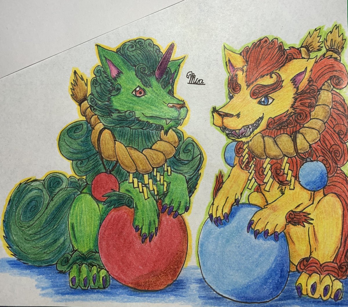 #イラスト 自作モンスター。神社の狛犬的な感じ。 ポーズ色塗り練習。
