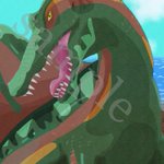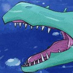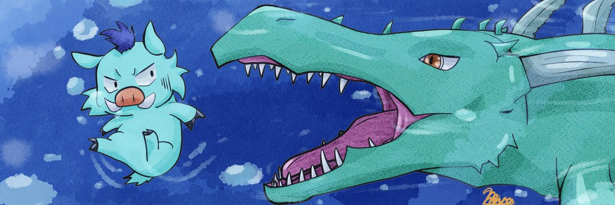 ヘッダー用なんてさ、見ないよね?でも名前、アカウント、の次に大事だと思って!! みらエルイノシシ、恐竜と海で泳ぐ をヘッダー用に描きました! #イラスト