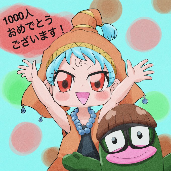 お祝いファンアートでーす!! テツさん(@pon_tetsu130)のRPG世界ナナイロのキャラクター、ヒィリちゃんです✨ミニキャラで描きました(*^_^*) 素敵で可愛い元気なイメージで描きました(*´∀`)♪テツさんも描かせていただきました! 改めて、1000人フォロワーおめでとうございます㊗️🎊