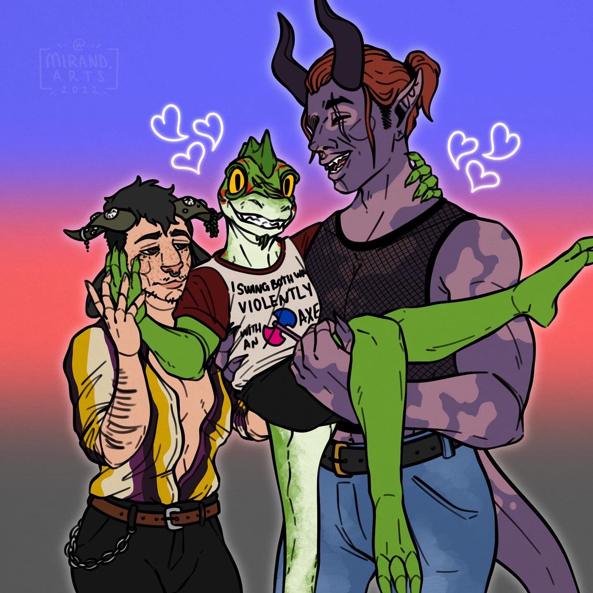 rhys and his partners, was supposed to be a pride month drawing but i lost drawing motivation this summer // #DnDcharacter #dnd #dndart #dungeonsanddragons #characterdesign #artshare #artistsupport #ArtistOnTwitter #commissionsopen