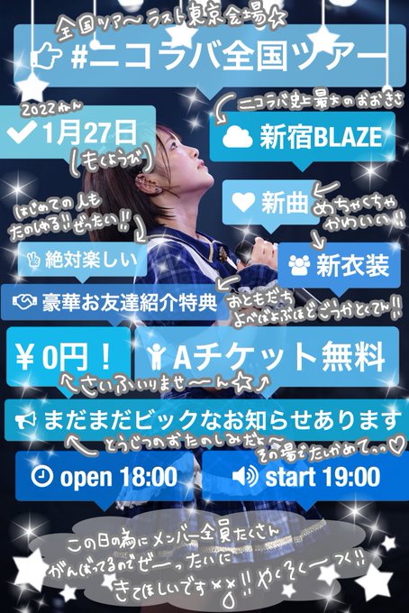 ニコラバ全国ツアー東京会場ラスト新宿BLAZEさんまで今日であと3週間になりました!!みんな準備出来てるかーーー🥺❄️??新衣装も新曲もセトリも全部楽しみにしててね💙 Aチケット無料です🌟 tiget.net/events/156468
