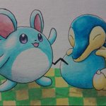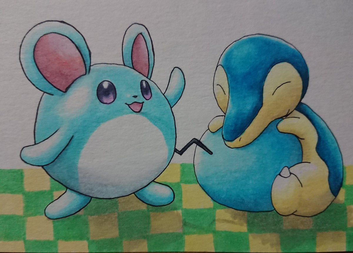 マリルとヒノアラシを #コピック で塗り終わりました。マリルのしっぽは最初透明ぽくに塗ろうと思ったのですがよくよく考えたら、水晶ではなく浮きとかブイがモチーフだから透明にしない方がいいなと。マットなテイストです。