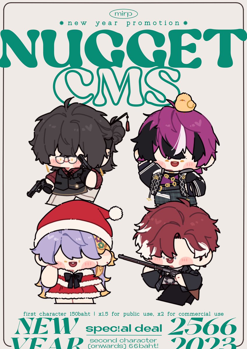 — nugget cms with new year promotion 7 คิว ˗ˏˋ จองได้ตอน 14.00 ´ˎ˗ • ราคาโปรโมชั่น ตัวแรก 150 บาท ตัวที่สองเป็นต้นไป 66 บาท! (เต็มตัว) • x1.5 for public use | x2 for commercial use • พร้อพ +30 ต่อชิ้น/ประเภท • เพิ่มฉากได้แล้ว! +100 บาทต่อภาพ (อ่านต่อในเธรด) #commissionTH