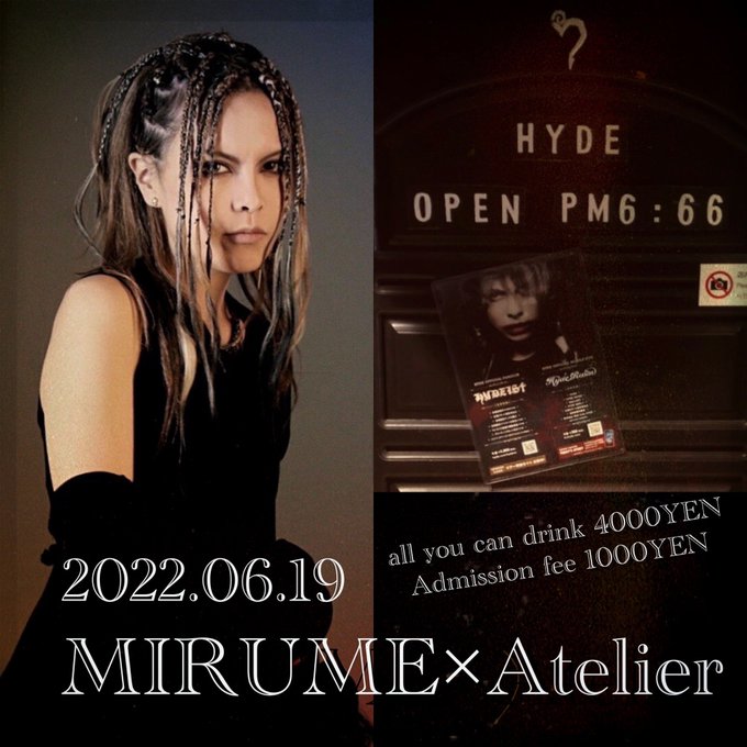 3年ぶりに大阪行きます‼︎ 2022.6.19 MIRUME event OSAKA 2時間飲み放題 4000 yen+tax 入場料 1000 yen 1部18時〜20時 2部20時30分〜22時30分 完全予約制↓ 場所 bar アトリエ Twitter @atelier666_ DMにて受付