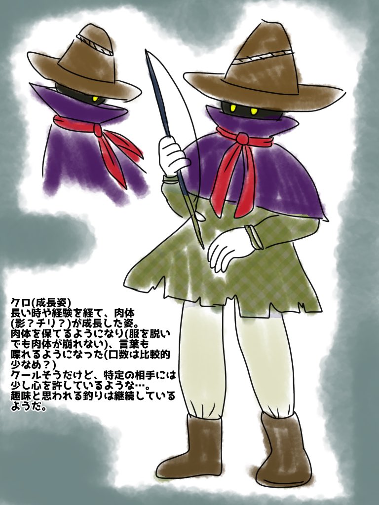 #きまぐれよその子ワンドロ資料 一日目と人外での参加失礼します。現アイコンにも描かれている旅人「クロ」を載せます 趣味は釣り。嫌いなものはお風呂と服を剥がされること 想像して描いた成長姿verも添えますが、どちらのverを描くかはお任せします よろしくお願いします ※用が済んだら消す予定 twitter.com/sutafes/status…