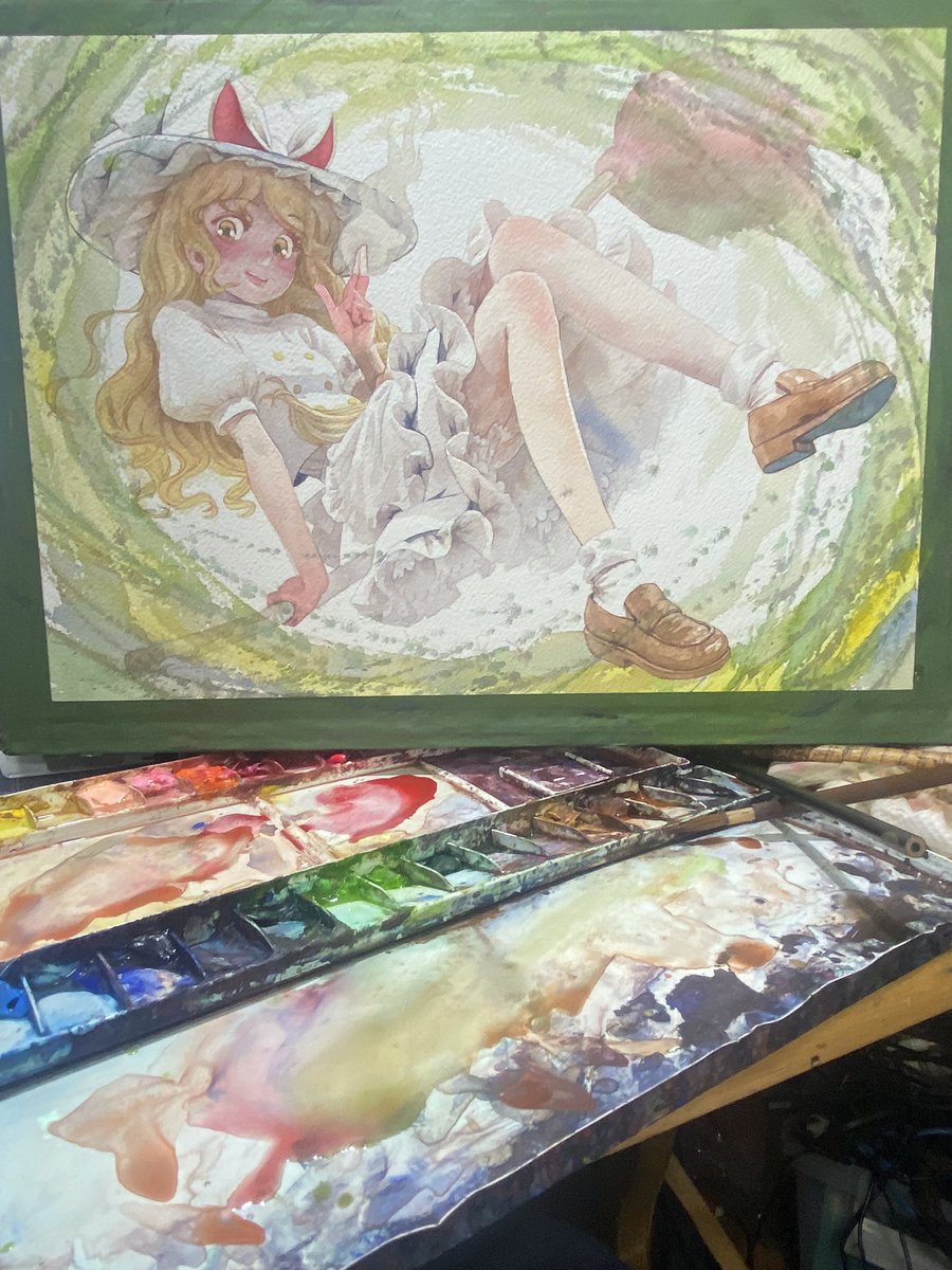 獣王園 魔理沙 制作途中、続き。 なんとなく習慣化しているのは、高明度の固有色から段々程明度に移行する描き方。なので『黒』がラストになることが多い。 #透明水彩 #霧雨魔理沙 #東方Project