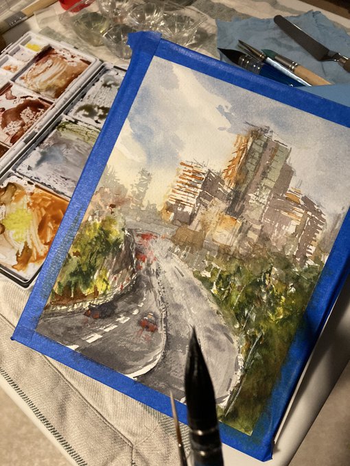The WIP for the above cityscape in watercolor. Looking towards Ebisu. F4 paper. #aquarelle #cityscape #painting #japanart #tokyo #allaprima #watercolor #watercolorart #イラスト #水彩画 #ArtistOnTwitter #traditionalart #wipart