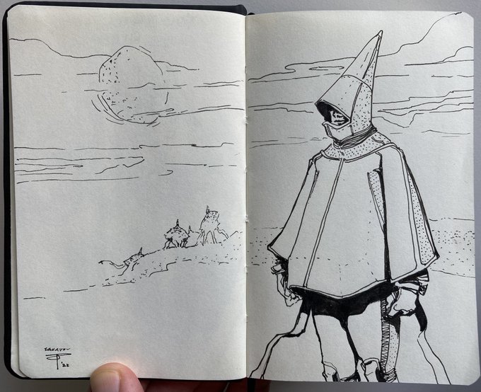 Sometimes when doodling about in a tiny sketchbook, you realize the strong influence of those before you. #doodle #sketch #inkdrawing #pen #落書き #sketchbook #characterdesign #traditionalart #scifi #スケッチ #artistsontwitter