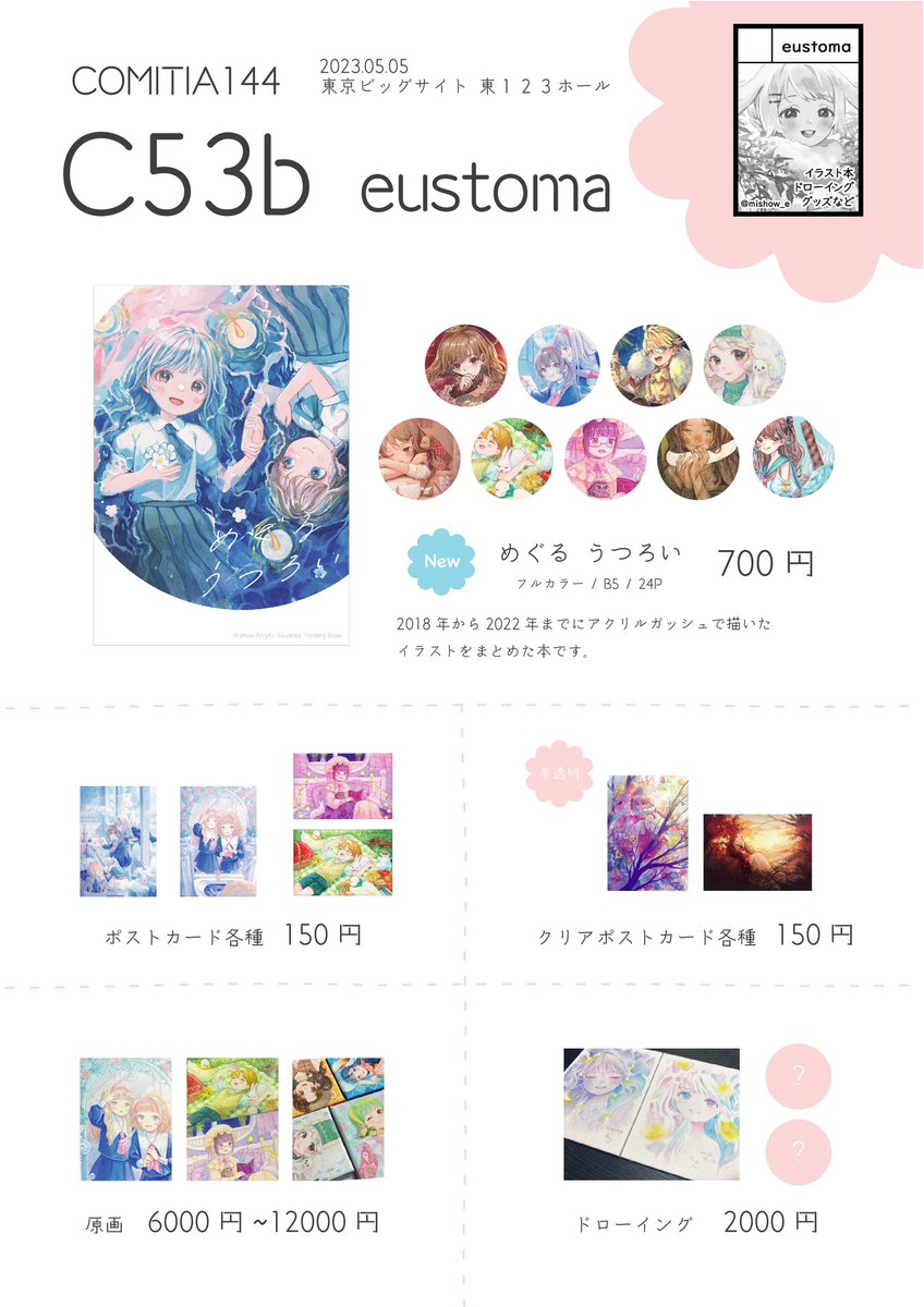 5/5コミティアのお品書きです! ---東3ホール【C53b】--- アナログイラストをまとめた新刊とポストカード、原画、ドローイングなど持っていきます。 どうぞよろしくお願いします🕊️ #COMITIA144お品書き #COMITIA144 #コミティア144