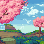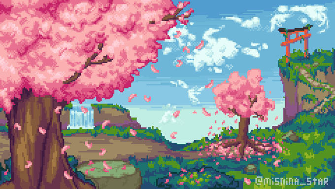 Here's the background by itself! I wasn't really planning on making it so detailed, but I got a lot of help from @infinitenonagon! #pixelart #pixelartist #ドット絵