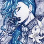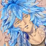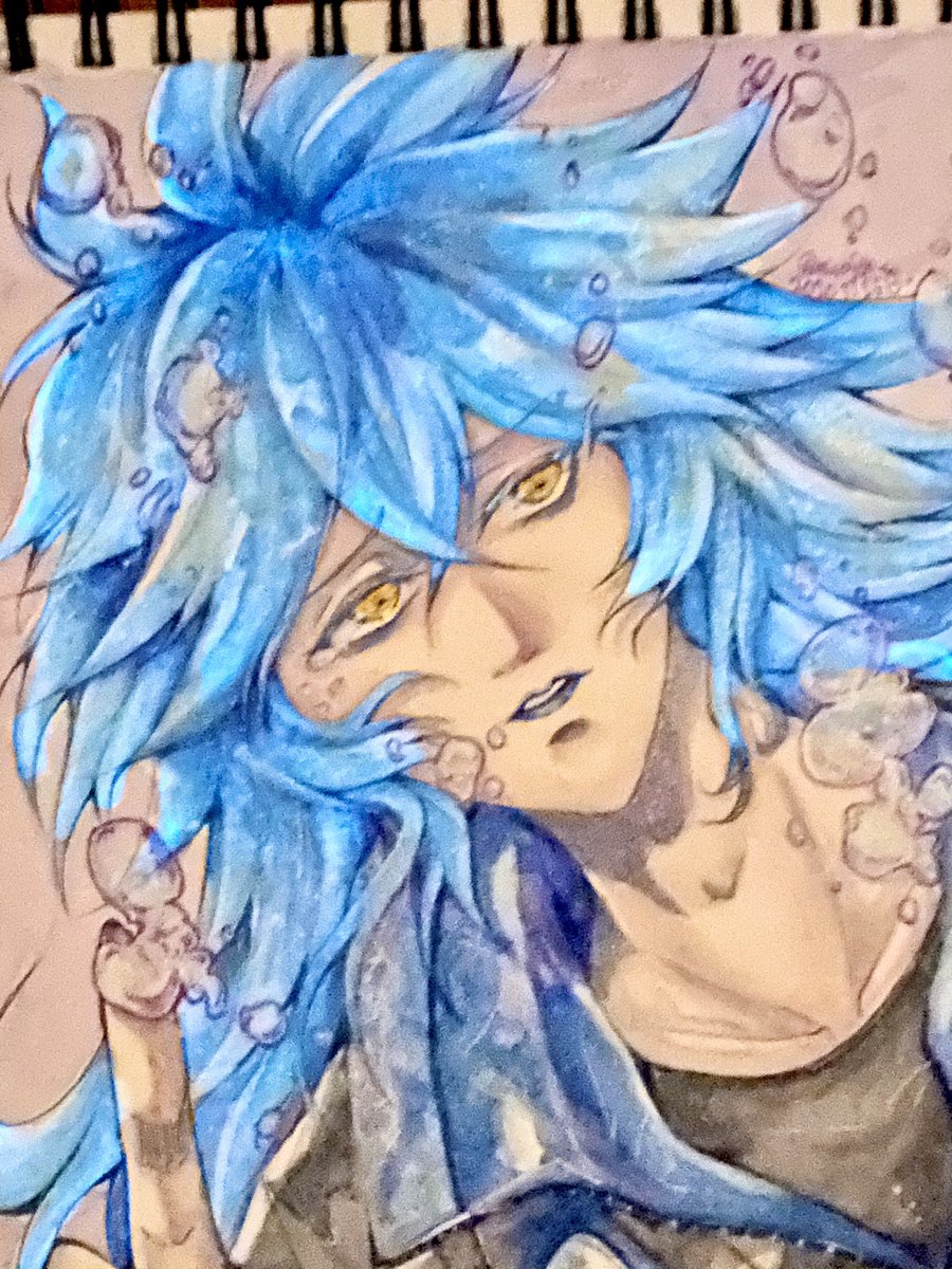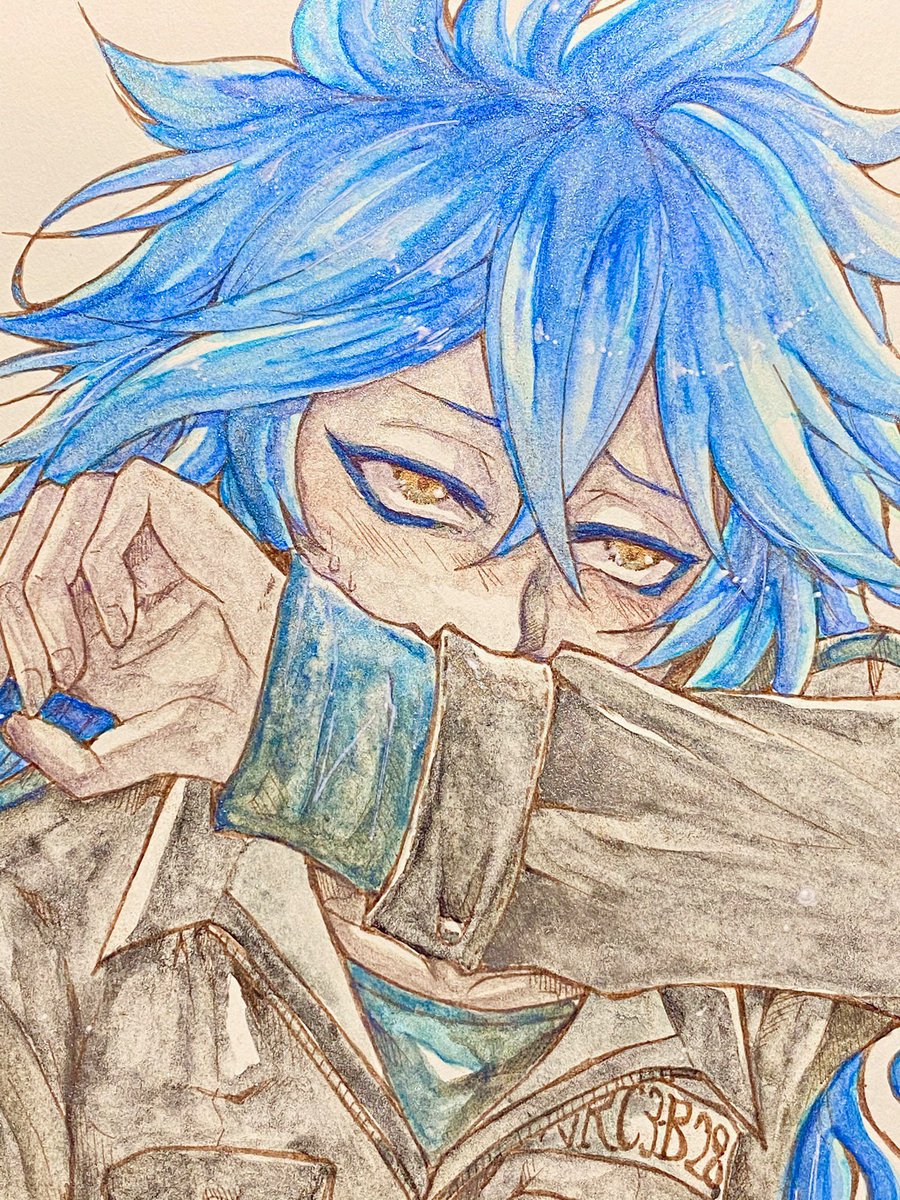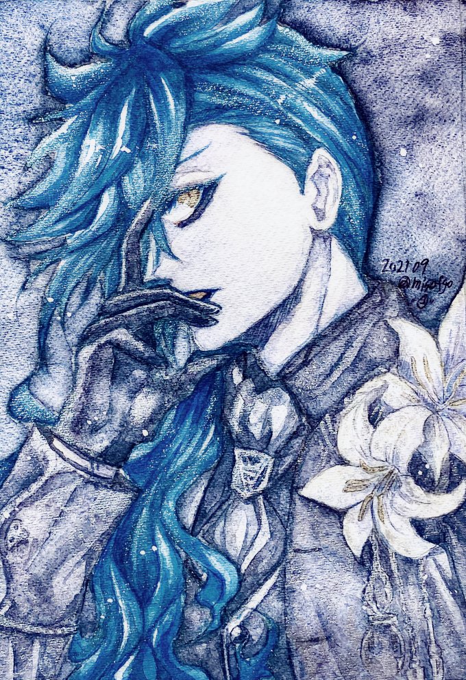 『イデア』 【使用画材】透明水彩、ラメ顔彩、アクリリックカラー、蓄光顔料 1枚目全体画 2枚目傾けるとラメが光る 3枚目暗闇撮影、蓄光顔料よりほんのり髪が青く光ります #ツイステファンアート