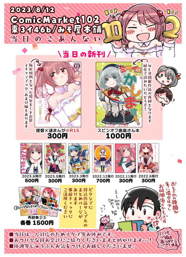 【☀#C102お品書き/1日目東3イ46b みそ屋本舗☀】 当日のご案内です!新刊は2種類あります~ 当日までの追加のおしらせ、及び補足はこちらのスレッドに随時追加していきますので、よろしくお願いします🙏 🌟WEBカタログはこちらから→webcatalog.circle.ms/Perma/Circle/1…