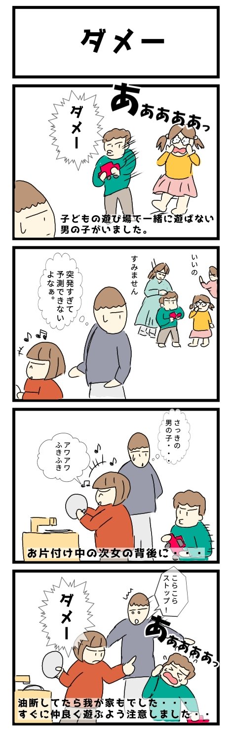 0 5 子供達が遊べる広場で次女が片付けをしてた時の出来事です。 突発的な行動に直ぐに対応出来ればなぁといつも思います。 #育児 #子育て #育児漫画 #漫画 #イラスト twitter.com/misoonigir/sta… 23/05/28 08:36