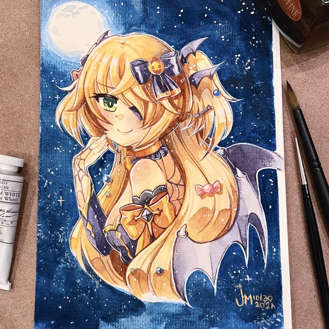 Enjoy Halloween with Fischl! 🎃 🦇 She miiiight share her candy if you ask nicely. 🍬 Watercolor on ~21x14cm #genshinimpact #genshinimpactfanart #genshinfischl #fischl #watercolor #watercolorpainting #FANART #animefanart #traditionalart #原神 #halloween #HappyHalloween2021