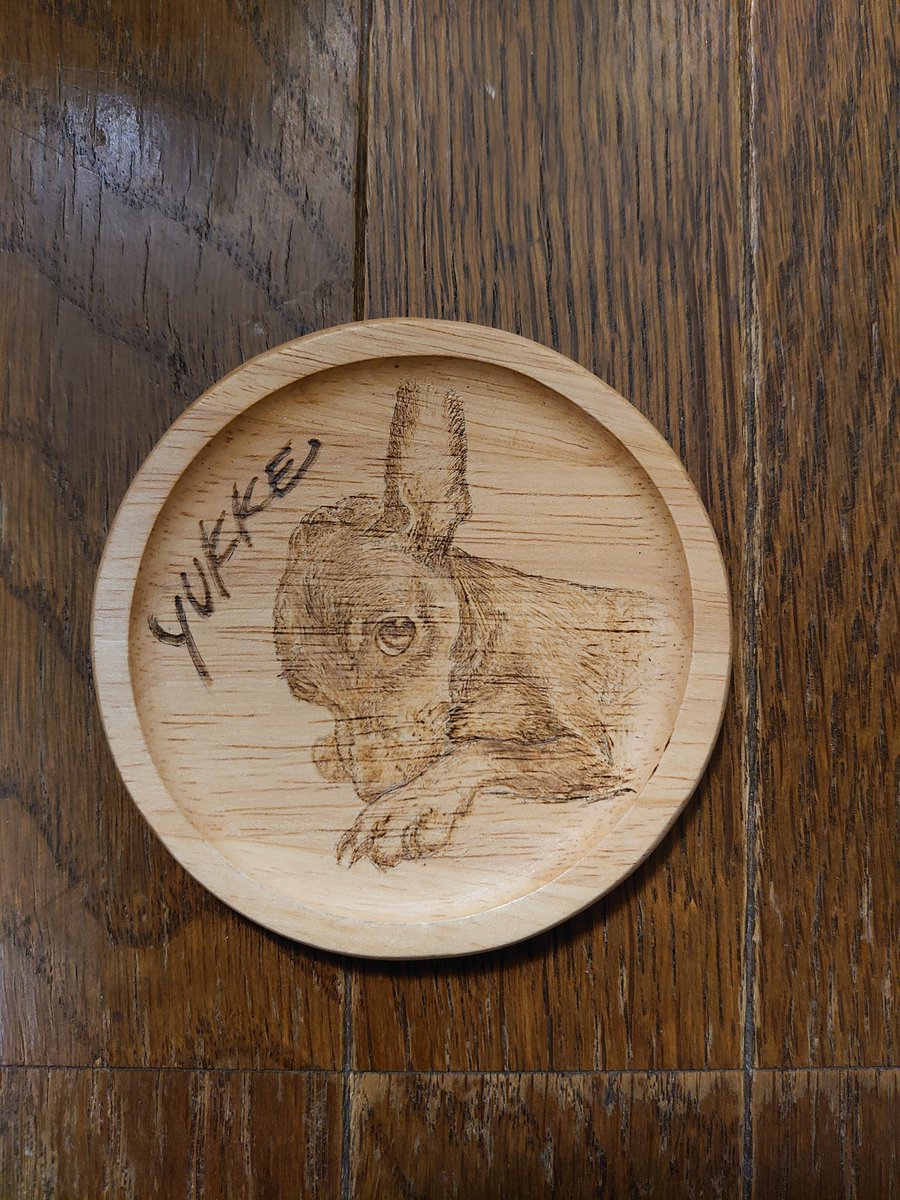 オーダー品☺️ 焦がし絵ペットの似顔絵コースター Creemaにて出品中です。 今回も、可愛い家族を描かせて頂きありがとうございました💖 #ペット似顔絵 #pyrographyart #woodburning #焦がし絵