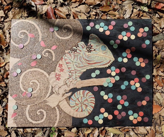 今週末は、デザフェスっ! 霞楽箱は、ブースNo.C-59.C-60 にて お待ちしてます。 カメレオン君のでっかいポスターが目印です!↓ #デザフェス57 @designfesta #pyrography #焦がし絵