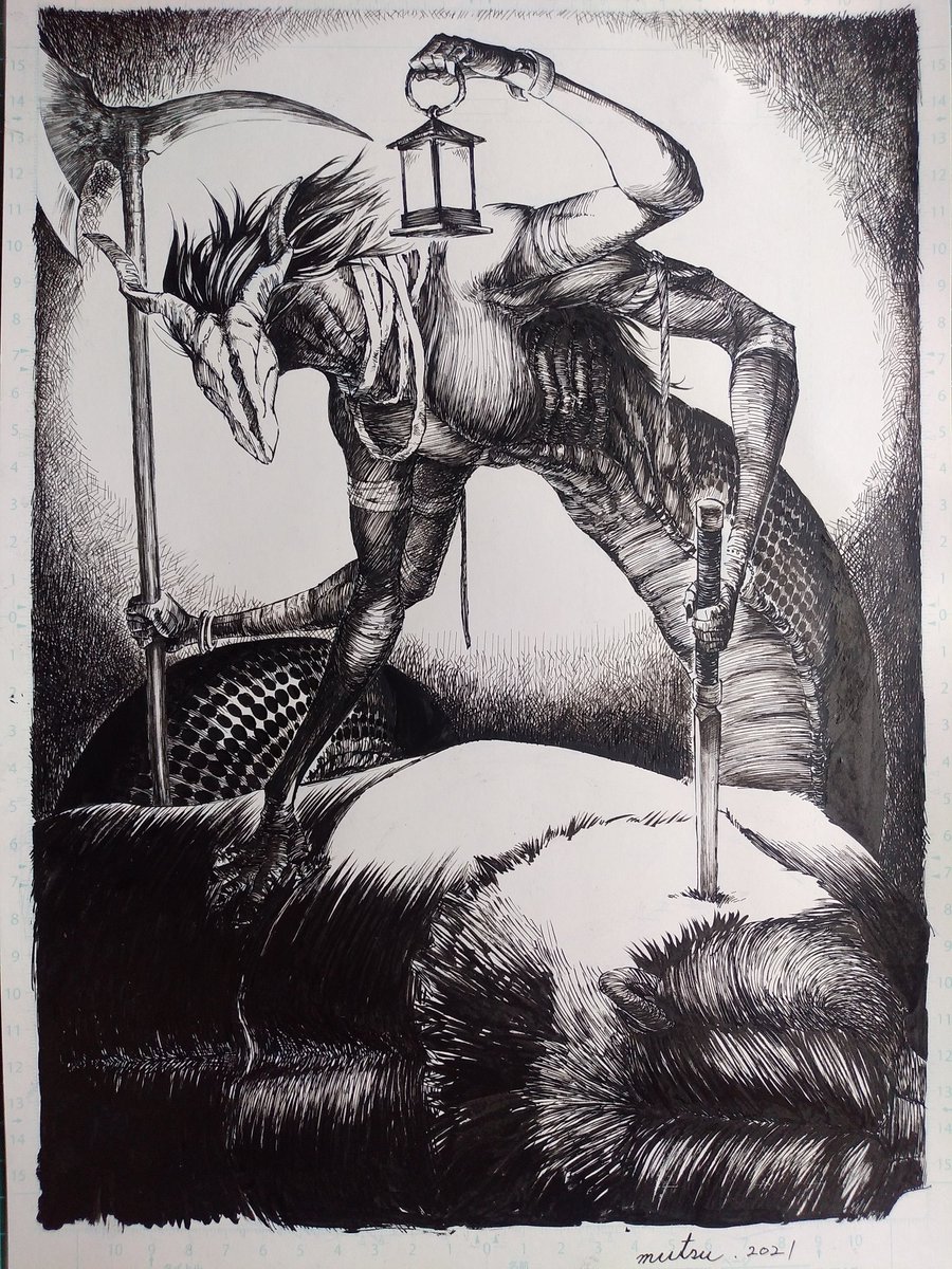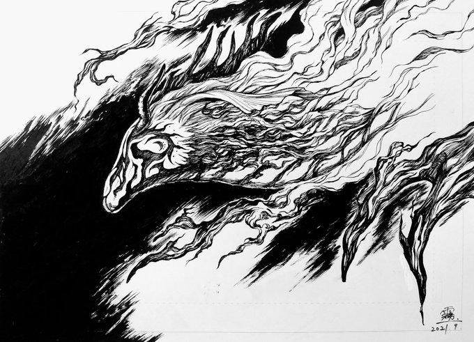 完成。 #アナログ #モノクロ #ペン画 #人外
