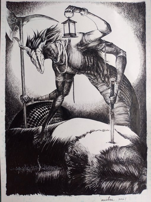19 160 完成。 #アナログ #モノクロ #ペン画 #人外 21/05/21 10:37