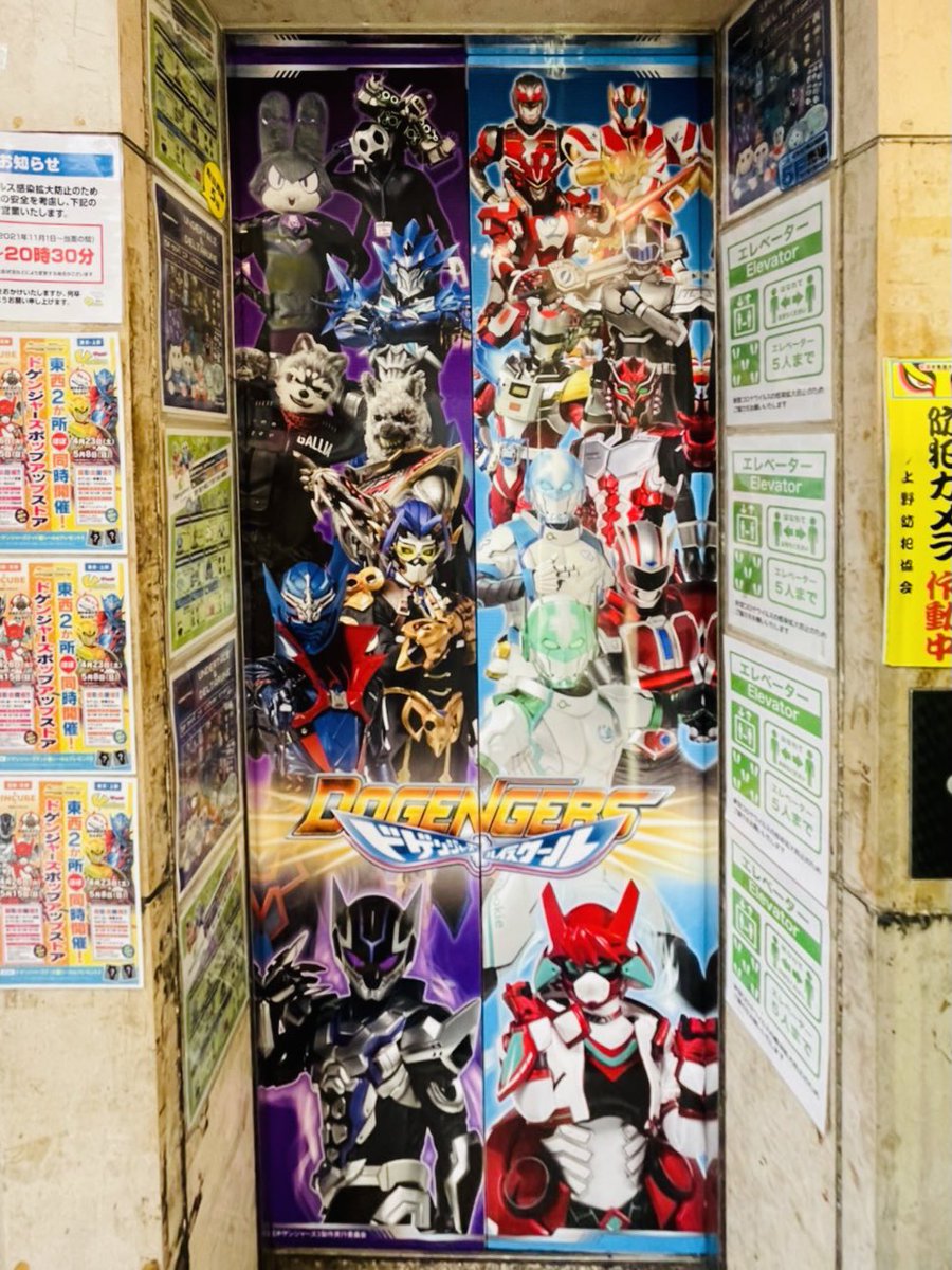 上野ヤマシロヤさんで開催されているドゲンジャーズポップアップストア行ってきた! すごいの!チカラの入れようが🥳 エレベーターは外から内側までびっっっしりドゲンジャーズ✨ 応援メッセージも描いたよ✏️ もう切袴(きれこ)がデカすぎて真子がパイルダーオンしてる😇