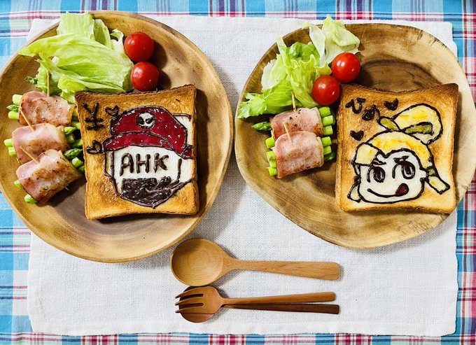 アルミ箔乗せてトースターで焼いて、白いとこにチョコやジャムで絵を描いていきます 喋さんは市販のチョコペンで描いてたけど途中でチョコ切れ。途中から家にあったチョコ溶かしてコルネで描きました チョコペンよく溶かさなかったのでおくちの辺り、汚くなっちゃった✏️ 切袴は髪の線忘れ〜