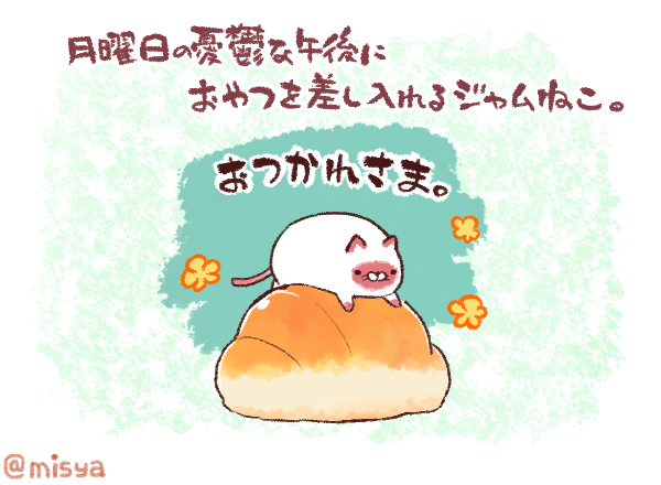 2 27 月曜日のけだるい午後に差し入れを持ってきてくれたジャムねこちゃんです。お正月休み、なんですぐ終わってしまうの…😩 #にゃんぱん #LINEスタンプ #イラスト 19/01/07 16:21