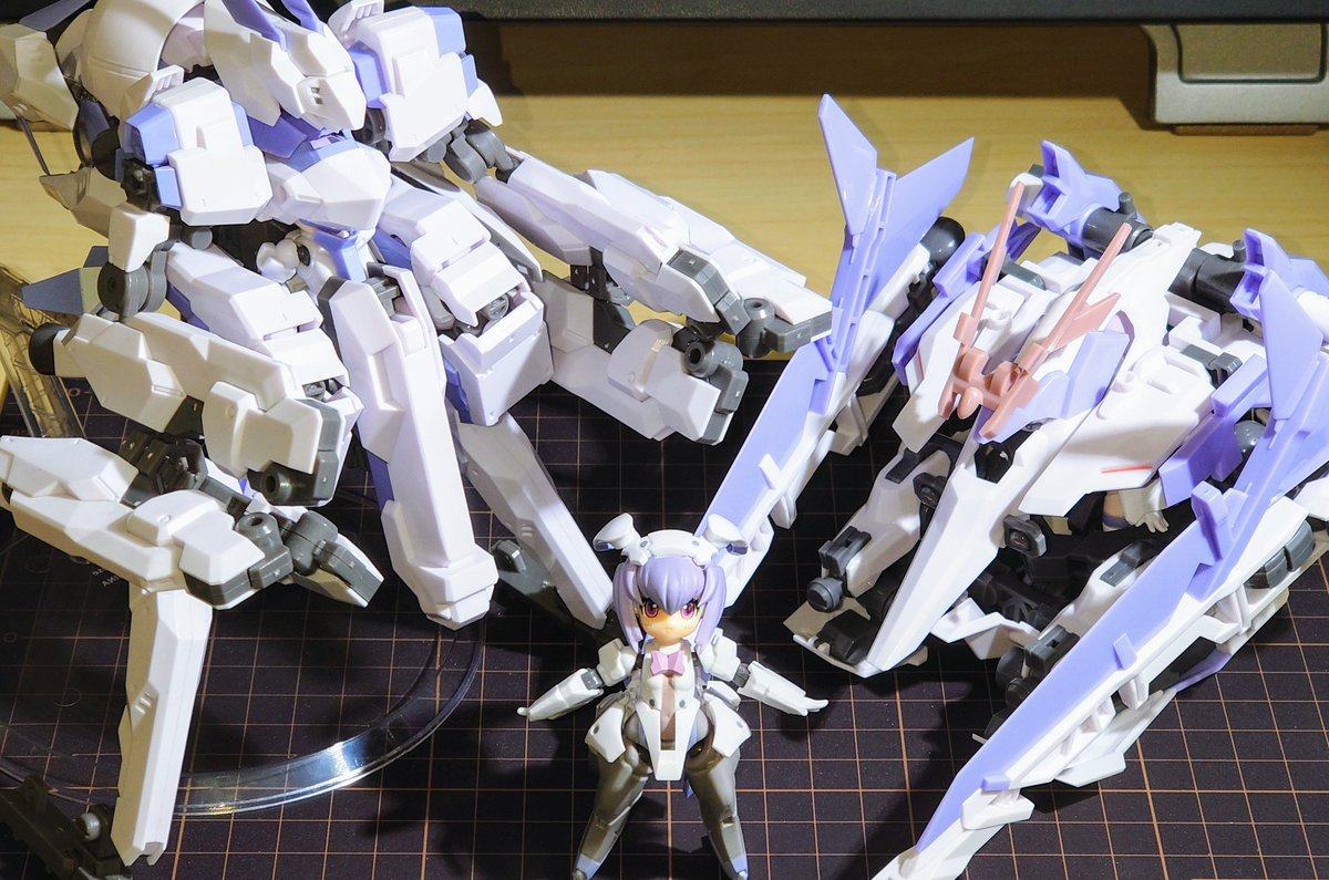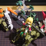 #今月作ったプラモ晒そうぜ DTAのジニー、サンマルMMのティアのアサシン、クアッドバイクのほうのヴォルパ、大型キャノンとアームユニットと近接戦闘用アーマー装備なアルト(アルト本体だけは数年前に作った物)。
