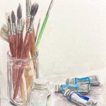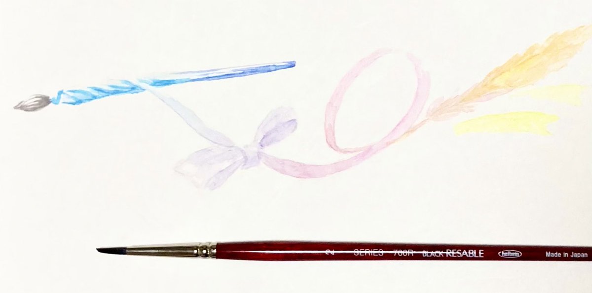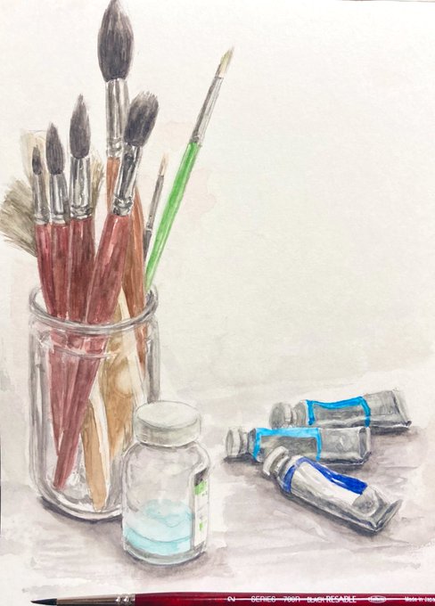 まだゴールまでありますが、今日は普段 お世話になってる筆や刷毛の皆さん それからマスキングと一部の絵の具を 描きました #水彩強化マラソン2021夏 #筆LOVE @HolbeinArt