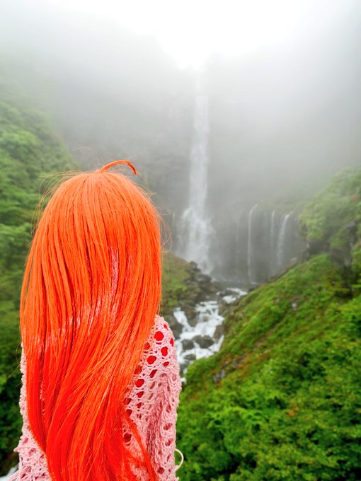 華厳の滝見に来たけど、雨のお天気で霧が濃いね 上の方は真っ白だ でも、流れる量と音は迫力があるね これで袋田の滝、華厳の滝をリナさんと制覇。三名瀑コンプまであと1つ! #リナインバース #ドルフィードリーム #うちのこかわいい #ドールオーナーさんと繋がりたい #華厳の滝