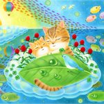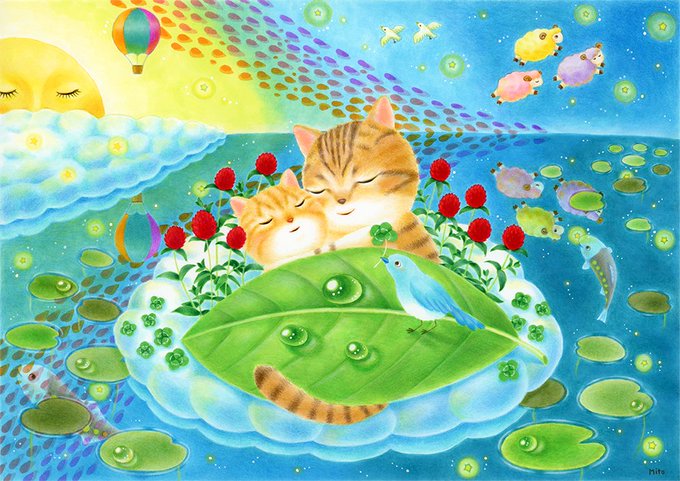 新作イラスト『眠る猫』 太陽と小鳥が朝の訪れを告げる中、猫の親子が湖の上に浮かぶ雲のベッドで気持ち良さそうに寝ています 明け方の心地よい眠りを、幻想的な景色とともに描きました #イラスト #デザフェス56 #猫 #イラスト好きな人と繋がりたい #絵柄が好みって人にフォローされたい #コピック