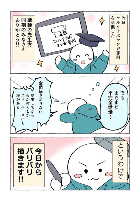 コルクラボマンガ専科7期生として昨日卒業しました! まだまだやれたんじゃないか、という悔しさから火が付いたので今からでもいっぱい描けばいいじゃんと思いました ご期待ください!(授業で習った言葉) #振り返りマンガ #コルクラボマンガ専科 #漫画が読めるハッシュタグ