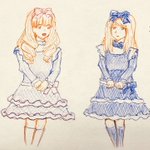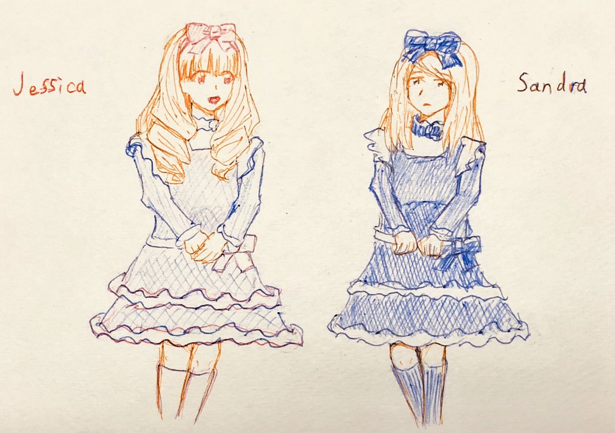 リメイク(2019と2023) アナログがリメイク前、デジタルがリメイク後 線画の色がカラフルになった 次にジェシカとサンドラを描く時は全身を描きたいな #人狼ジャッジメントイラスト