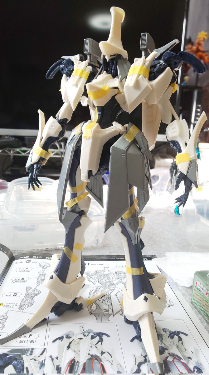 【ペーネロペー製作中】 あとは墨入れとトップコートで完成~カラーリングはうまくいったかな デカイけどパーツ数少ないから組むのはそんなに時間かからなかった メリハリ付けるのに部分塗装するつもりが結局全塗装してた 疲れた_(:3」 ∠)_ 仮組したからどっか塗装剥げてそう #ガンプラ