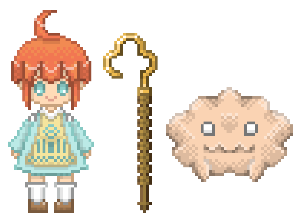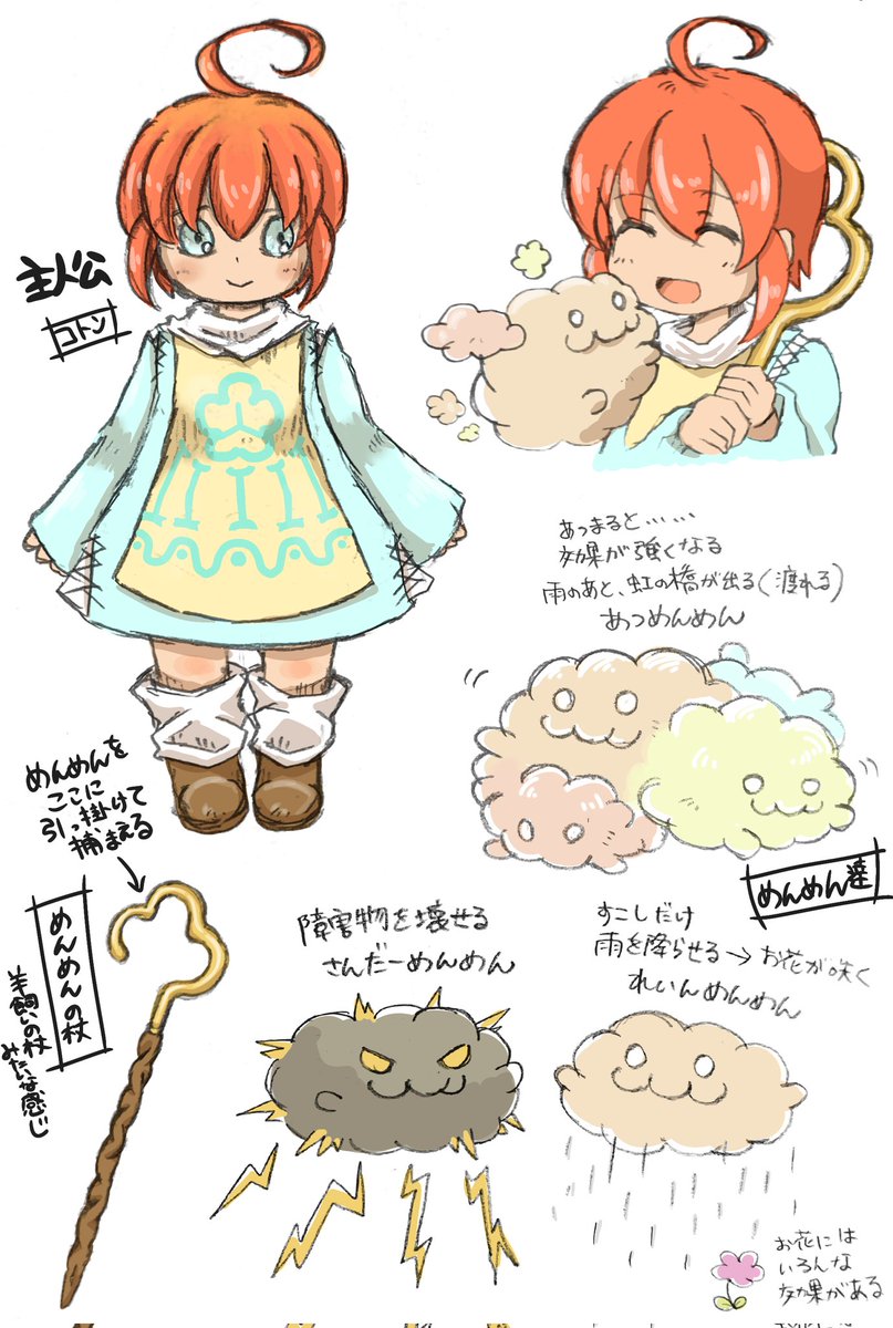 #創作イラスト #illustration 存在しないゲーム『めんめん』の設定イラスト☁️不思議な生き物『めんめん』と、めんめん飼いの『コトン』と一緒に不思議な旅に出掛けよう!みたいな2Dアクションパズル!……っていう空想です😌💤
