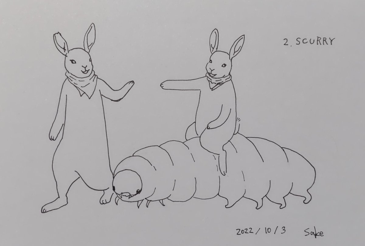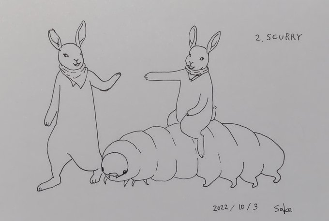 #inktober #inktober2022 2.SCURRY ちょこちょこ走る 私のインクトーバーは今日から開始! 有馬 礼(@ARIMAREIatMOON)さんのキャラをお借りしてます 魔物ウサギのルー🐰とジー🐰 ちょこちょこ走る芋虫に乗ってます