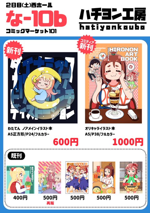 来週にせまった「コミックマーケット101」2日目(土)のお品書きです~ 創作ジャンルですが、新刊はわたてんになります~ コミティアで出したオリジナルの新刊もあるよ! 乃愛ちゃんの色紙も1枚用意する予定です~🌙 「西な-10b ハチヨン工房」にてお待ちしておりま~す! #コミックマーケット101