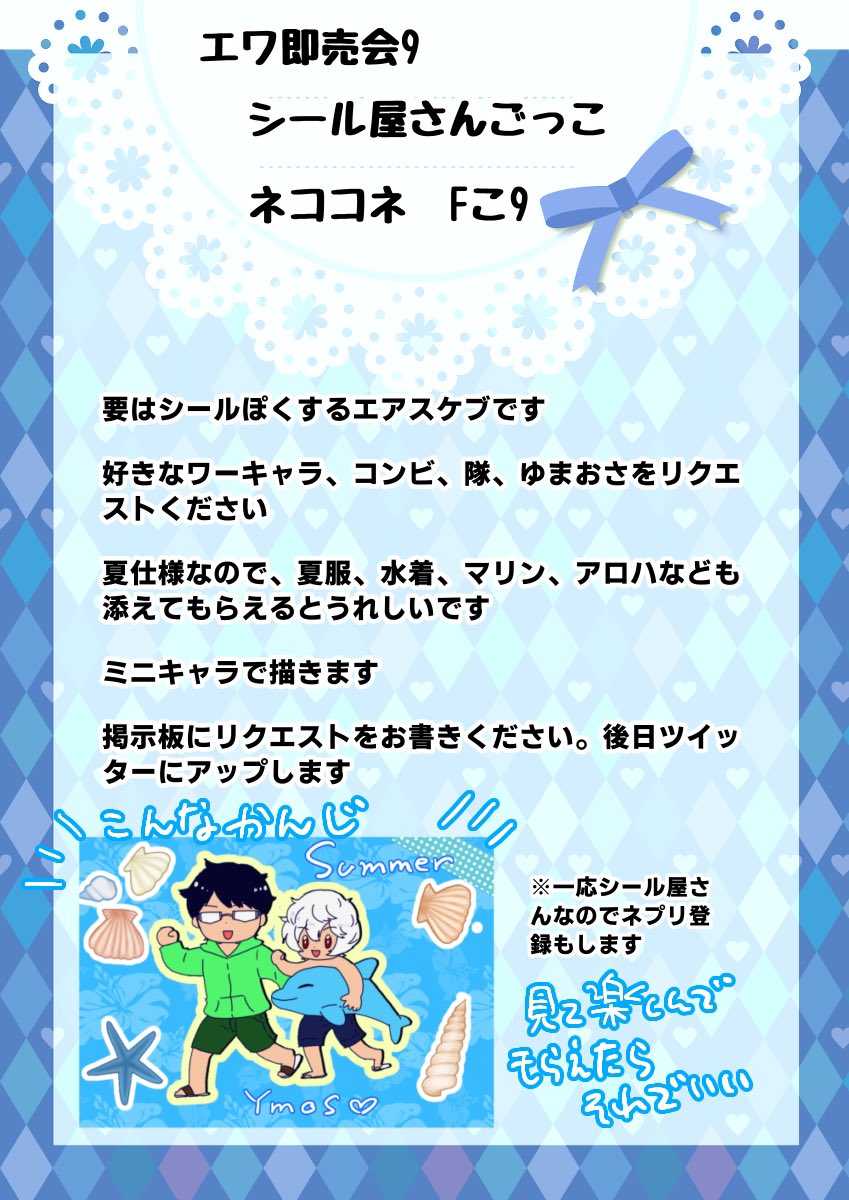 #エワお品書き202307 ネプリ番号は当日お知らせします🌺エアスケブもやってますので、遊びに来てください🏖️マンガはツイッターとpixivで展示、感想もらえるとホッとします〜 twitter.com/mitukiwa2323/s…