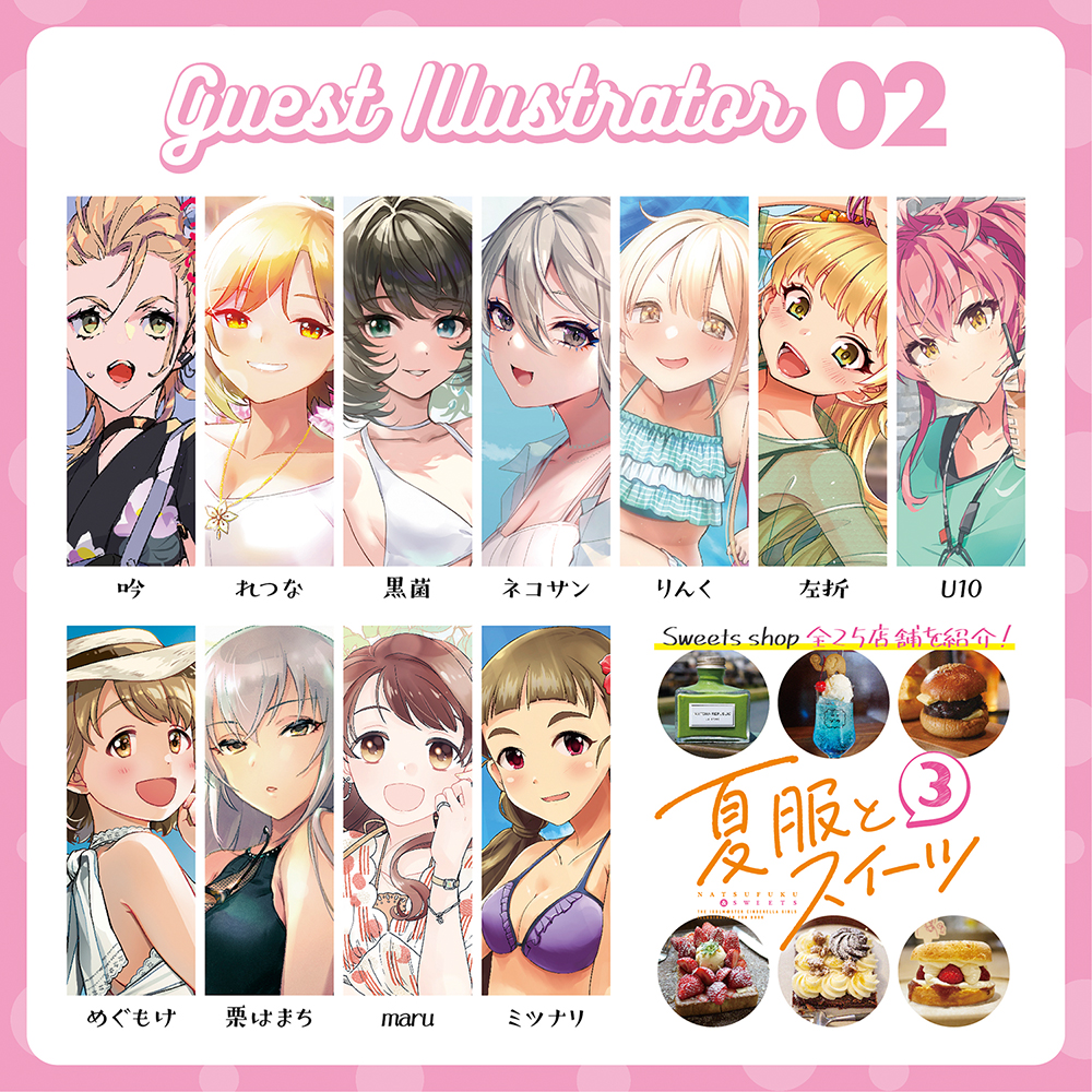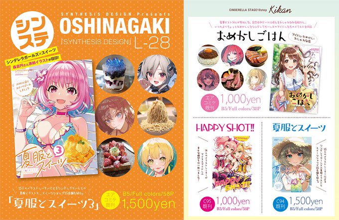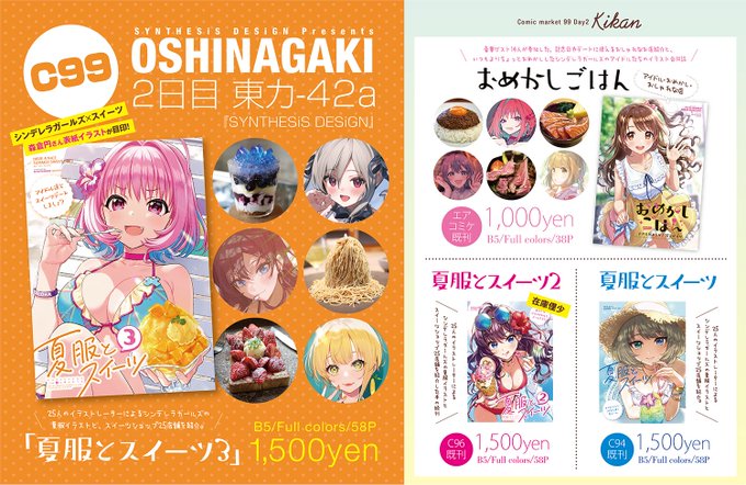 【#C99 告知①】 『夏服とスイーツ3』 豪華イラストレーター陣25人によるシンデレラガールズの夏服・水着デートイラストと、スイーツのお店25店舗を実際に食べ歩き、写真付きで紹介したシリーズ最新作です!☺️✨ 書店でも委託中! メロン melonbooks.co.jp/detail/detail.… とら ecs.toranoana.jp/tora/ec/item/0…