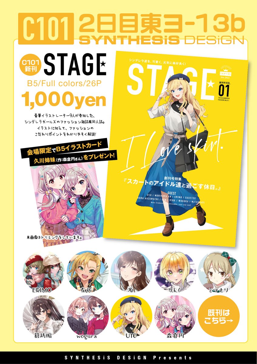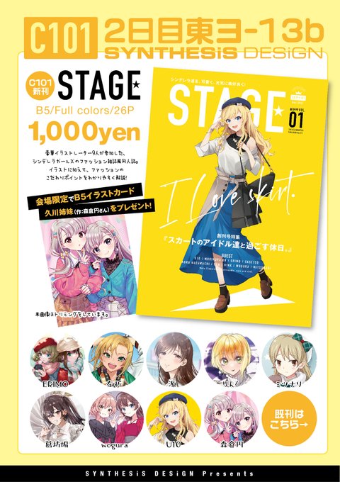 【#C101 #コミケ101 新刊】 『STAGE』 豪華イラストレーター陣9人によるシンデレラガールズのファッション雑誌風同人誌。創刊号は『スカート』がテーマ!それぞれのイラストのファッションポイントも記した、見て楽しい、読んで楽しい一冊です✌️ 書店委託中☺️✨ メロン🍈→melonbooks.co.jp/detail/detail.…
