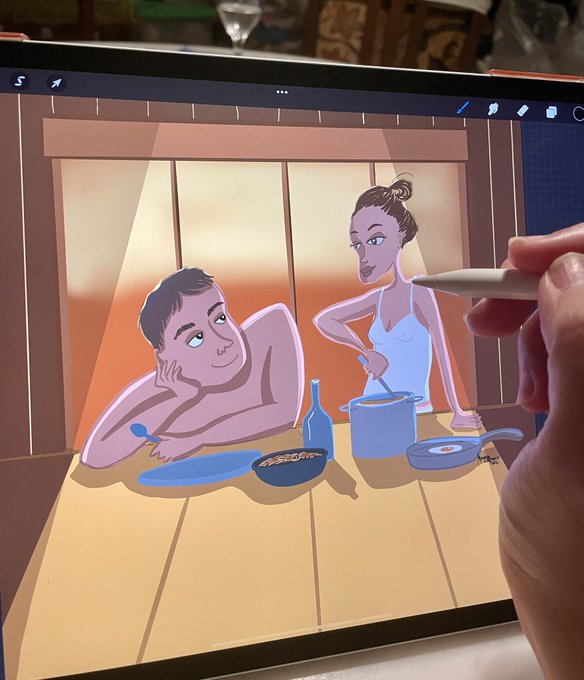 “Morning After” (2021) That quiet dusk moment when you just spent the night together and she cooks you breakfast while you stare at her lovingly, thinking about how lucky you are. And you ARE lucky to have her in your life. #artistsontwitter #artistsofSEA #illustrator