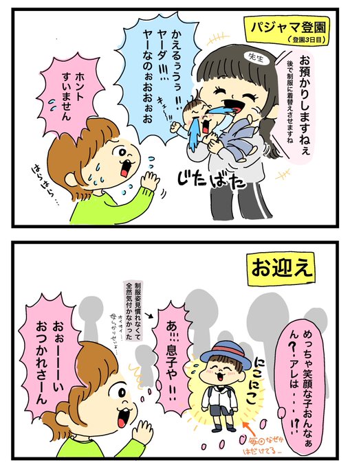 1 0 【幼稚園 登園】その2 さてさて今日もどんな顔して帰って来るかな😅幼稚園頑張れ〜❗ #漫画が読めるハッシュタグ #育児漫画 #育児絵日記 #3y8m #3歳 #登園拒否 #登園しぶり #パジャマ登園 23/04/14 12:46