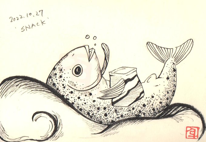 0 15 #inktober2022 #インクトーバー2022 day27:SNACK スナック 手癖で描くと魚🐟になる…。 22/10/27 21:00