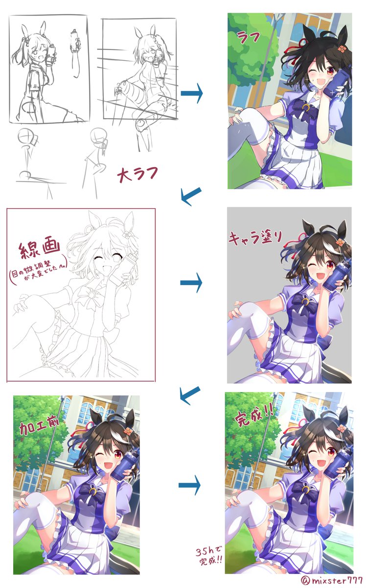 この度は数多くの反応ありがとうございます! 予想以上に反響があったことや、野生の公式と言って頂けて大変うれしかったです✨ こういったコンテンツの二次創作は初めてですが、独学で頑張ってウマ娘の公式絵に寄せて描いてみました🌸 感謝の意も込めてプロセスを貼らせていただきます! #ウマ娘 twitter.com/mixster777/sta…