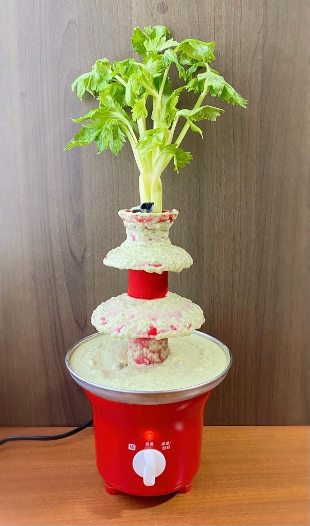 半田セロリフォンデュみたいに本体にセロリぶっ刺したかったけど、中央の回転軸がトルネードなので紐とかで縛れず断念したの図。 もし固定できてたら、電源ONでセロリも大回転してバッサバッサする愉快な代物になるよ多分。